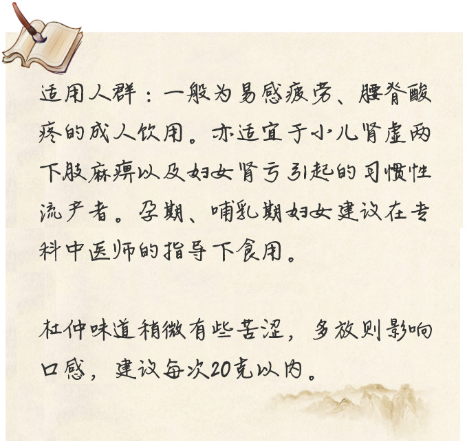 杜仲:性温,味甘微辛,具有补肝肾、强筋骨,壮腰的功效。