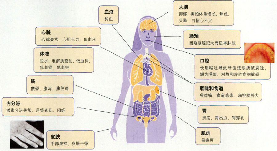 以瘦为美的社会文化,女性追求完美以适应职业竞争的需要,患者个性中的问题,如:缺乏自信、控制力差等带来的压抑食欲既可产生厌食,也可呈反转相,表现为发作性暴食,或者说神经性厌食和神经性贪食为同一疾病的不同表现形式。