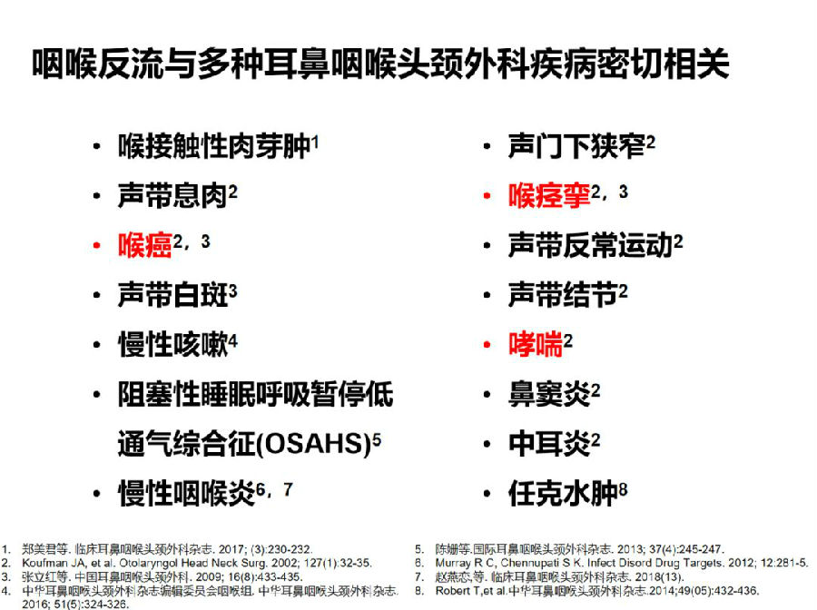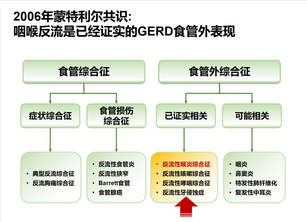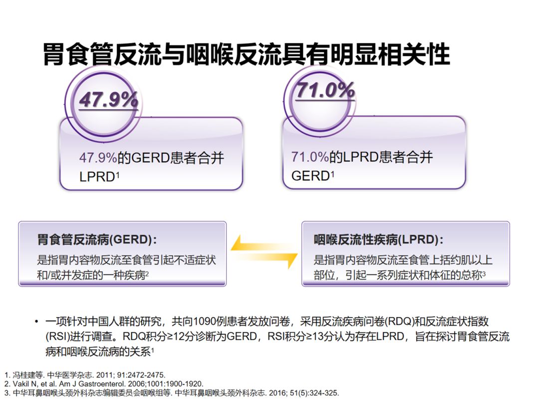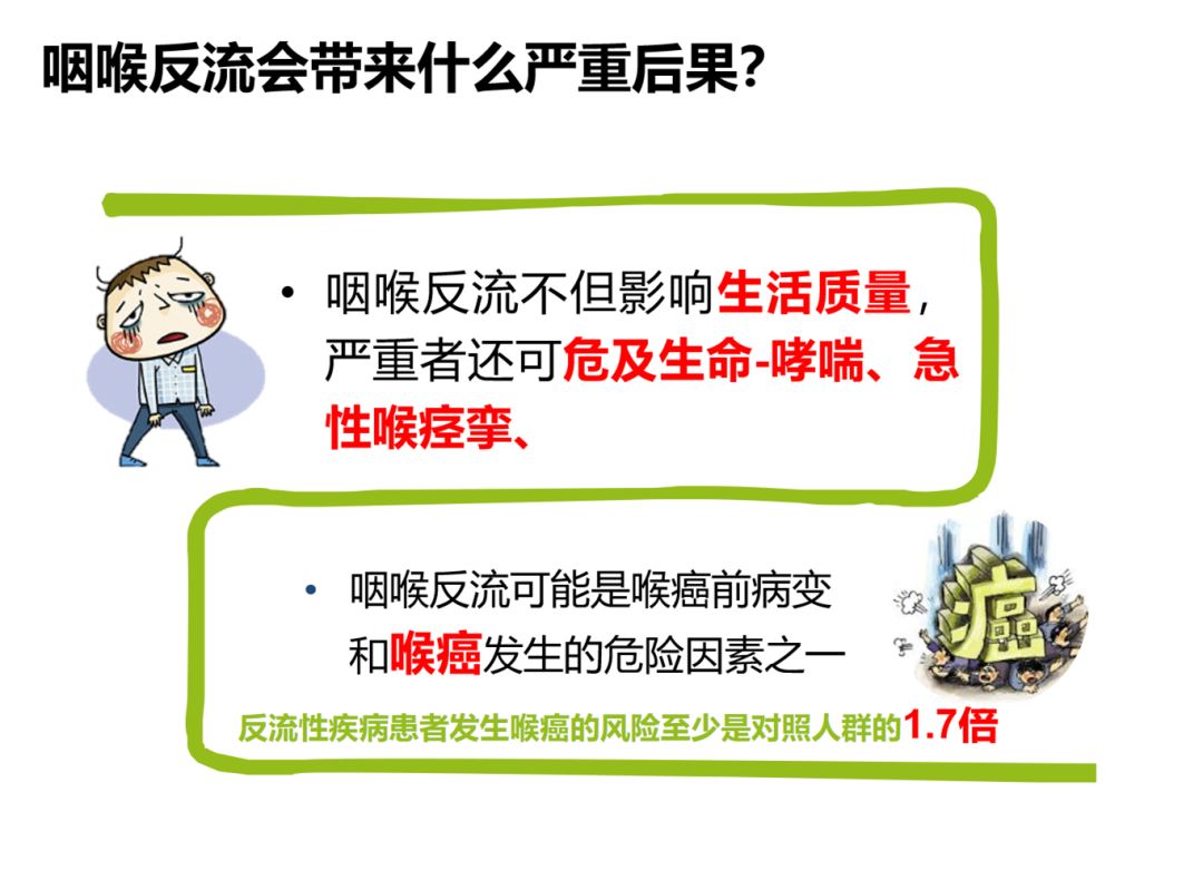咽喉反流是已经证实的胃食管反流病的食管外表现,是胃内容物(含胃酸、胃蛋白酶、胆汁等)反流至食管上括约肌以上的上呼吸消化道:咽喉、鼻咽、气管、肺部等,引起一系列症状和体征。