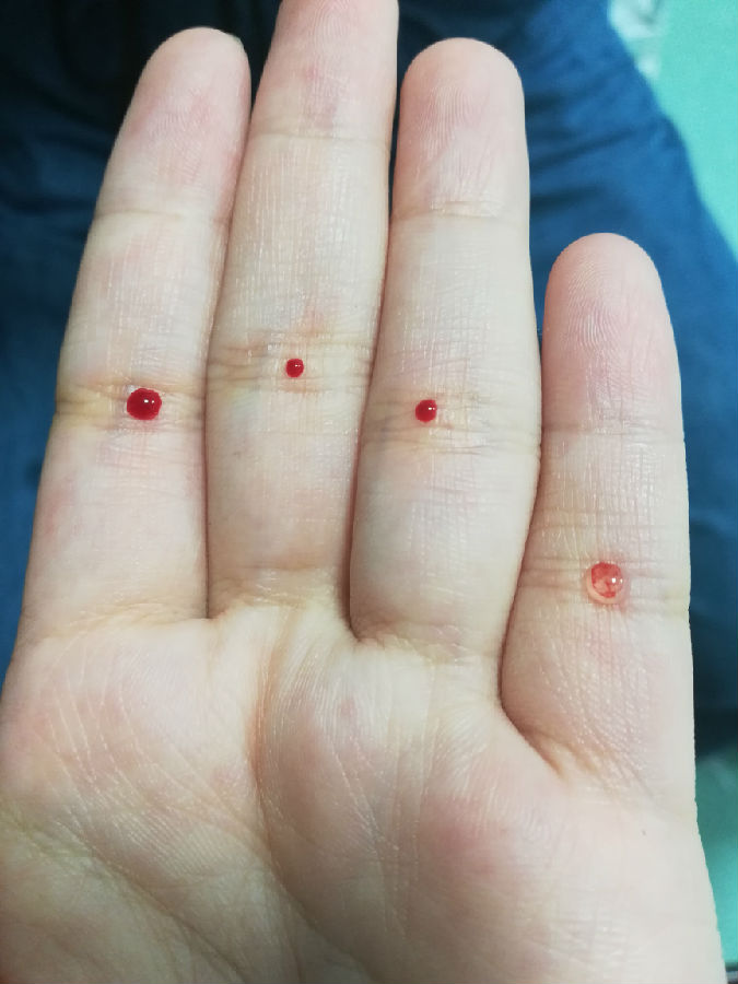 (左图粘液较多,右图粘液较少,但仍需巩固,若刺出液体都是血珠,可以不再做)