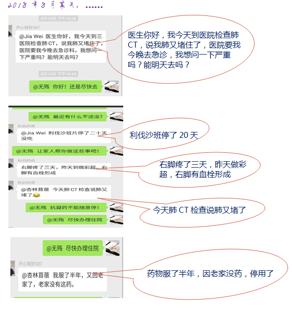 38岁黄大哥,是一名货车司机,平时喜好打麻将,有吸烟嗜好,2018年2月份的一天因下肢静脉血栓形成,引发肺栓塞;经过医院抢救和治疗后病情得到好转,出院后患者黄大哥服用利伐沙班抗凝预防血栓。
