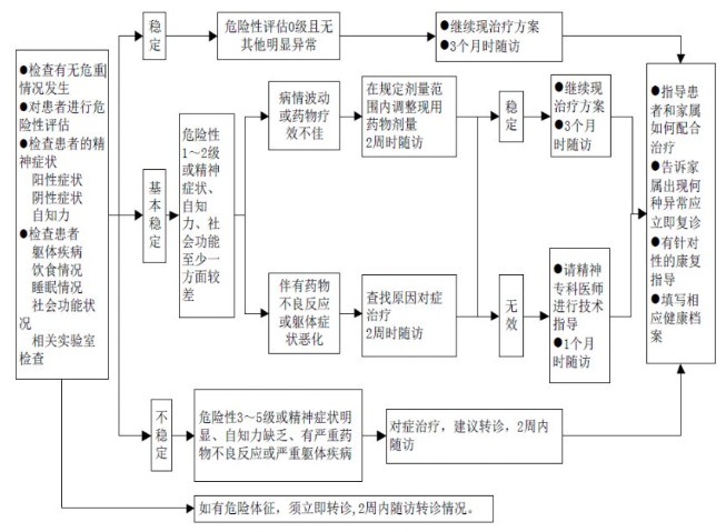 03分类干预:根据患者的危险性评估分级、社会功能状况、精神症状评估、自知力判断,以及患者是否存在药物不良反应或躯体疾病情况对患者进行分类干预。