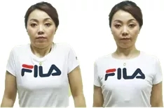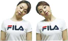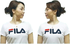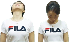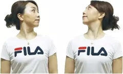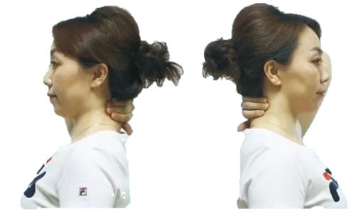头转向左侧45°,眼睛看向前下方一米半处,吸气同时下巴向前探出,到极限位置屏气2秒,吸气同时下巴向前探出,到极限位置屏气坚持2秒,呼气同时下巴收回,调整呼吸;右侧同法。