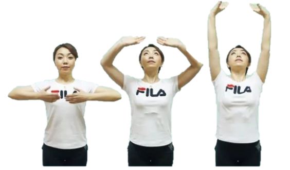 吸气双手向上托举,同时抬头向上看,将身体向上拔伸,呼气同时头部回正,双手放下。