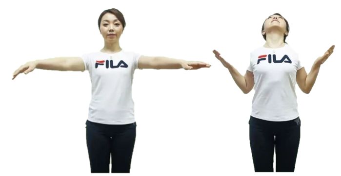 双手展开,吸气同时抬头,双手肘夹紧用力向后缩,到极限时屏气坚持2秒,呼气同时双手打开头部回正,双手放下。
