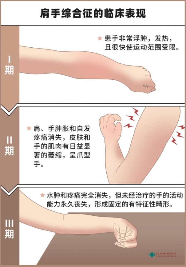 肩手综合征是脑卒中后突发出现的手肿胀、肩部疼痛、运动受限、手水肿的继发性并发症。常在脑卒中后一至三个月内发生,又称反射性交感神经性营养不良(RSD)。疼痛将影响患者的康复,不予以治疗,将导致永久性手及手指的畸形。