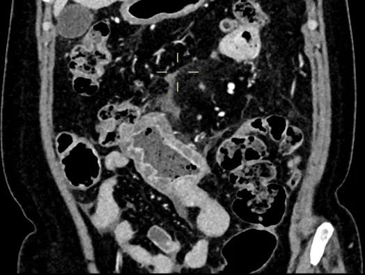 全腹增强CT扫描:克罗恩病并小肠穿孔、腹膜炎治疗后。中下腹部节段小肠肠壁增厚并周围渗出病变,较前进展,局部少量积液;局部小肠扩张并管壁水肿,可疑不全性肠梗阻;下腹壁切口疝形成。