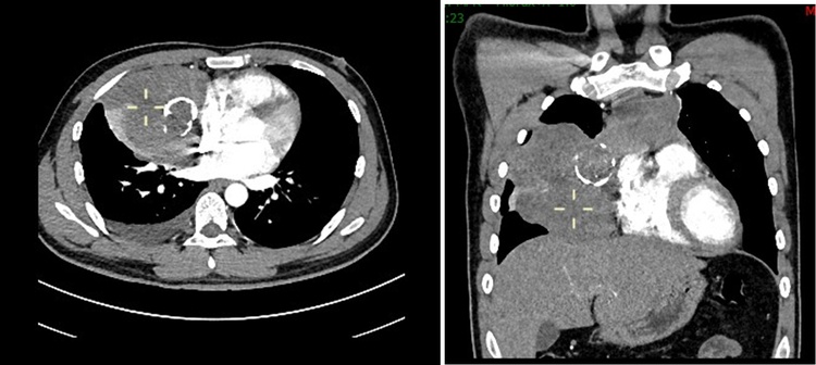 莫先生今年27岁,近年来在行走后经常出现下肢无力的情况,尤其是爬楼梯后更感觉迈不动腿。近3月来,症状逐渐加重并出现眼皮下垂、视物重影、咀嚼无力、发音不清、活动后胸闷、气促、咳嗽及胸痛等症状,且症状晨轻暮重。小莫意识到自己身体出现了状况,在家人的陪同下来到深圳市中医院检查。CT检查发现前上纵隔有一巨大肿块,直径达10cm。肿块向右侧胸腔生长且与上腔静脉、无名静脉、心包及右肺中叶分界不清(图1)。经脑病心理科和心胸外科联合会诊,诊断为胸腺瘤合并全身型重症肌无力。由于肿瘤巨大,已经压迫或侵犯邻近心脏、血管和肺组织,且胸腺肿瘤伴随有重症肌无力表现,莫先生面临随时出现呼吸循环衰竭的可能,疾病严重威胁着他的生命。