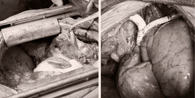 图2:左:切除部分受侵犯心包;右:肿瘤完整切除,人工血管置换后。