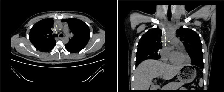 深圳市中医院心胸外科团队接诊患者后,经过缜密分析讨论,明确了手术指征和手术方案。7月7日,该团队在全麻联合针刺麻醉下为患者施行胸部正中切口纵膈肿瘤切除术。术中发现,肿瘤已侵犯右上腔静脉和无名静脉、心包及部分右肺中叶,肿瘤与受侵犯组织间粘连紧密,无明确分界。为保证完整切除肿瘤,需要切除被侵犯的上腔静脉、无名静脉、心包及右肺中叶组织。同期行人工血管置换成形术。经过3小时紧张的手术,医生顺利地完整切除了肿瘤及受侵犯组织,进行了上腔静脉和无名静脉人工血管置换,手术过程中患者呼吸循环平稳,头面部无静脉回流障碍表现。(图2)。