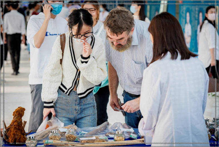 在中医药互动体验区,药学部为师生们准备了精彩纷呈的中药标本展览与讲解,并提供了现场制作的养生茶。面对包含植物、动物、昆虫与矿石的琳琅满目的中药,师生们表现出了极大的兴趣,提问不断,流连忘返。