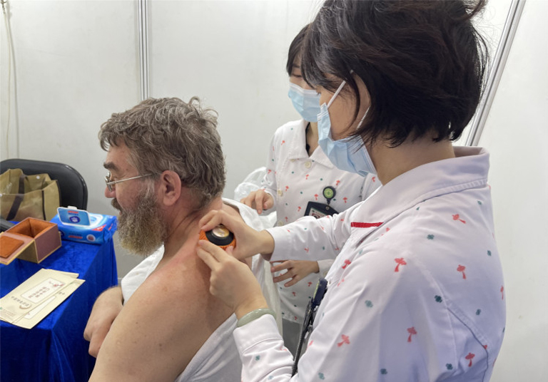 在推拿科、门诊中医综合治疗区的医护人员们提供的中医整脊与竹药罐、火龙罐、耳穴压豆等中医特色疗法体验区前,排队师生络绎不接,外籍教师在体验过中医特色治疗后,纷纷对中医效如桴鼓、立竿见影的神奇效果赞叹不已,并要求与深圳市中医院医务人员合影,留下这一特别时刻。