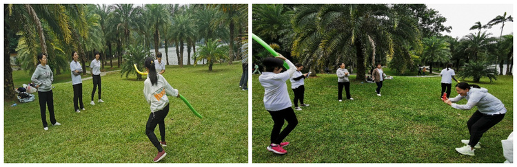 在“蒙眼打人”游戏中,安插在“敌方阵营”的卧底疯狂误导对方“出战选手”,导致有的选手离目标越来越远。更精彩的是,戴眼罩的选手把树错认为是“敌人”,横七竖八地挥打了半天棒子。游戏结束后,大家开心地笑得直不起腰。
