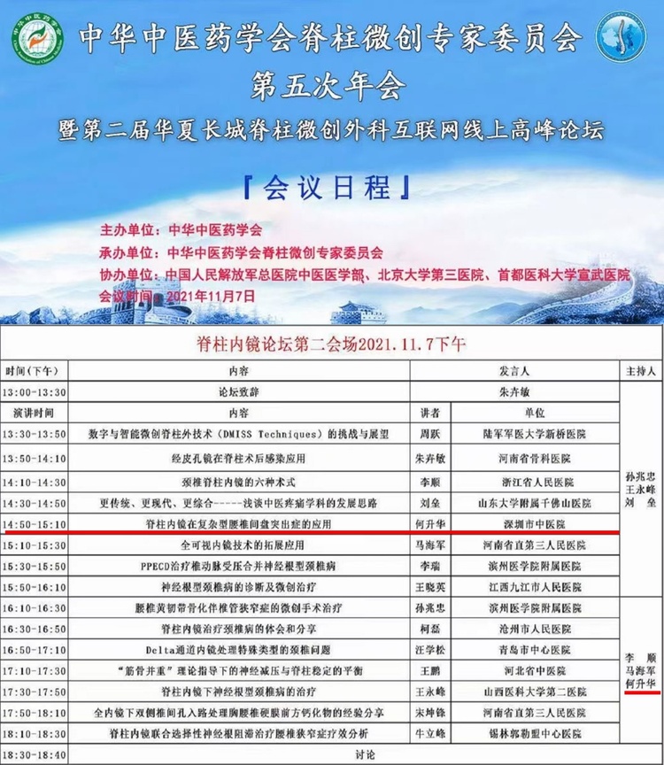 11月7日,中华中医药学会脊柱微创专家委员会第五次年会顺利举办,深圳市中医院骨伤科二病区(脊柱专科)何升华主任受邀参加。在线上会议上,何升华主任发表了题为《脊柱内镜在复杂型椎间盘突出症的应用》的精彩演讲并主持了会议。