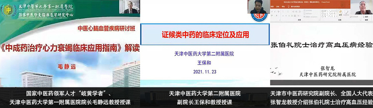 张伯礼院士中医临床团队进行线上授课。其中,国家中医药领军人才“岐黄学者”、天津中医药大学第一附属医院院长毛静远教授对《中成药治疗心力衰竭临床应用指南》进行了制定说明;天津中医药大学第二附属医院副院长王保和教授介绍了基于辨证的中药新药创制;国家中医药管理局第五批全国名老中医药专家张伯礼教授学术思想和临床经验传承人江丰副研究员分享了张伯礼院士中风病诊治经验;国家中管局中医药骨干创新人才华声瑜教授详述了参附注射液体外促血管舒张的机制研究;国家中药材标准化与质量评估创新联盟秘书长郑文科副研究员分享了中成药临床价值及评估技术;天津市中医药研究院副院长张智龙主任介绍了张伯礼院士治疗高血压经验;天津中医药大学中医药研究院张俊华院长分享了循证医学与中医药优势评价。