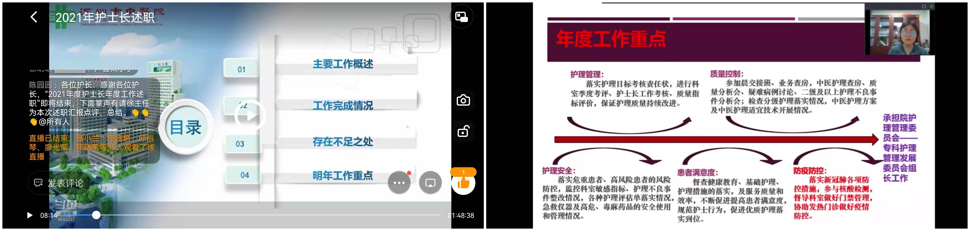 2021年,“十四五”规划的开局之年,也是我们直面疫情,英勇奋战的不平凡的一年。鉴往知来守初心,砥砺前行担使命!在积极响应疫情防控工作要求的同时,为了对上一年的工作进行全面盘点及反思,全方位总结“十四五”开局之年的护理发展规划和新一年护理发展之道,2022年1月11日,2021年护士长述职报告会在线上顺利举办。