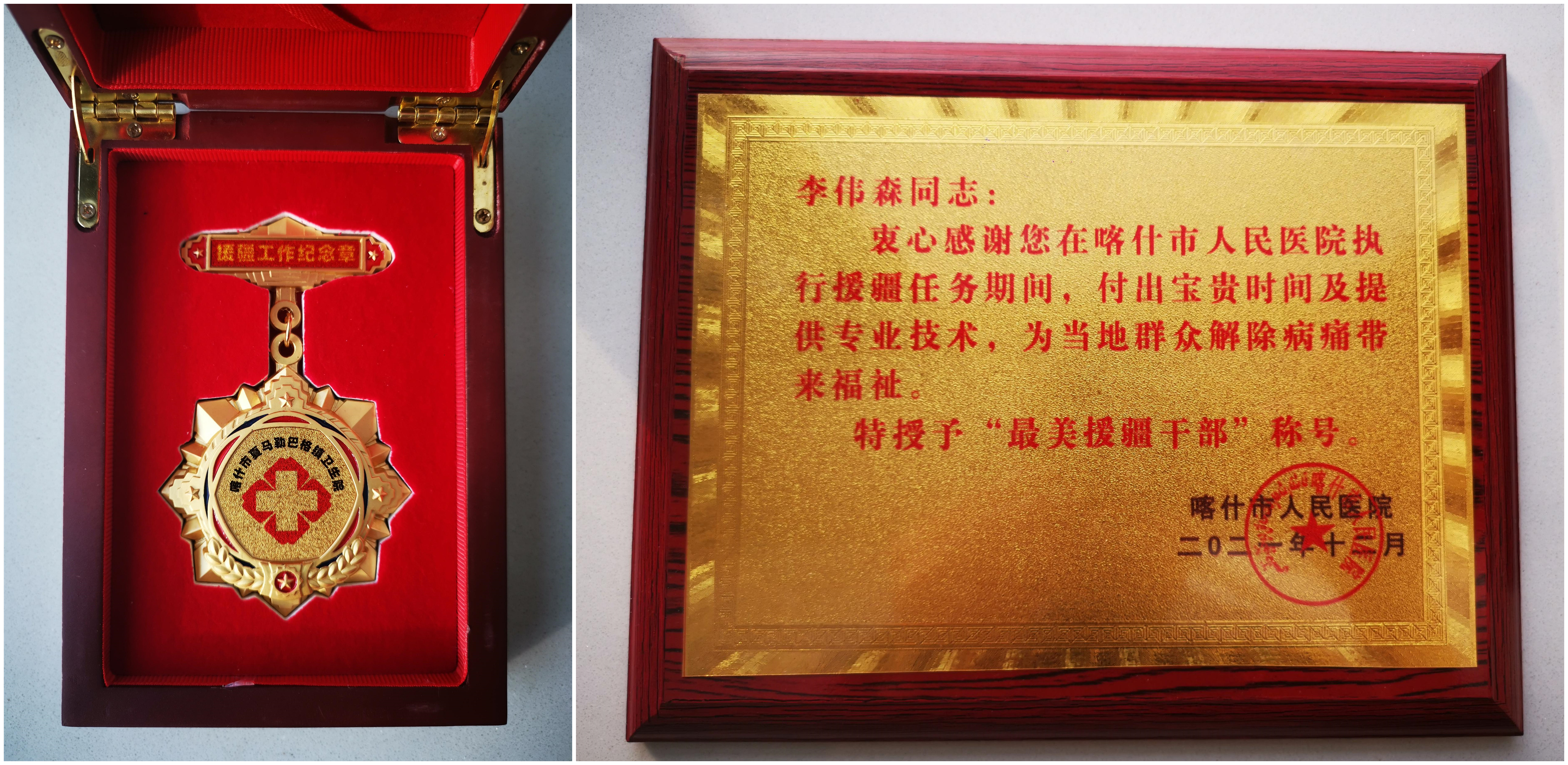 因工作表现优异,李伟森医师获喀什市人民医院及夏马勒巴格镇卫生院授予多份荣誉及感谢信。