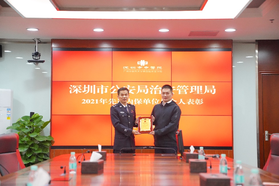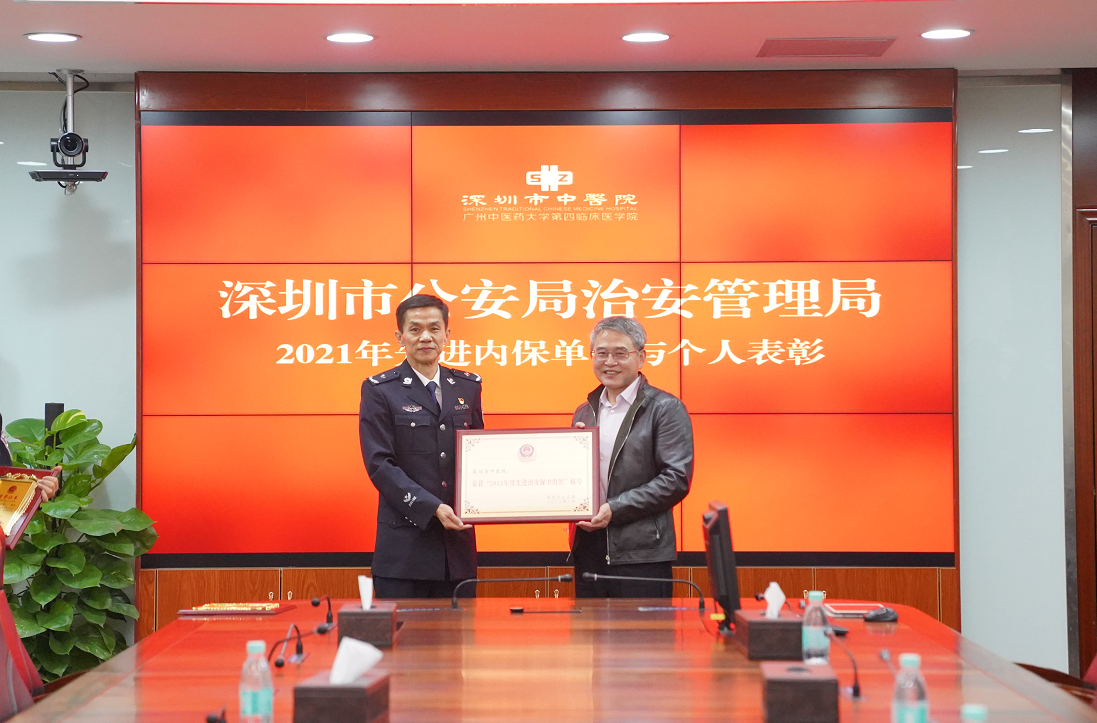 2022年1月20日上午,深圳市公安局治安管理局王川副局长一行5人来深圳市中医院进行安全保卫工作检查调研,并为深圳市中医院颁发2021年度深圳市内部治安保卫工作先进集体和先进个人奖牌。深圳市中医院易铁钢院长、徐明珍副院长及相关职能部门人员接待了工作组,并陪同座谈。