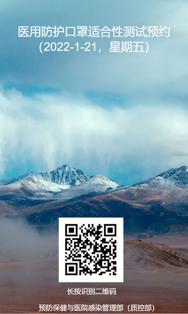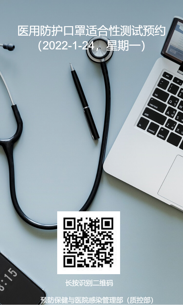 预防保健与医院感染管理部(质控部)——感染管理科已对发热门诊、急诊科等重点科室工作人员进行检测,为个人选择适合的防护口罩提供意见。现面向全院职工开放测试机会,为避免聚集及长时间等候,请有意向参加测试的职工扫码提前预约。