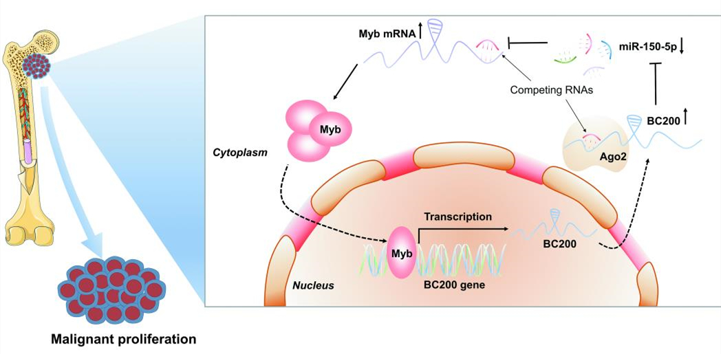 图2. lncRNA BC200/miR-150-5p/Myb调控MDS细胞恶性增殖模式图