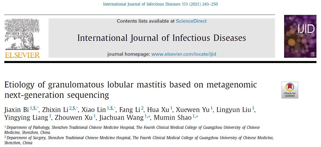 近期,病理科与外科合作的一篇研究论文正式发表在《International Journal of Infectious Diseases》,该杂志即时影响因子9.846。文章揭示了肉芽肿型小叶性乳腺炎的发病机制,同时,首次报道了“EB病毒相关性乳腺炎”这一新的乳腺炎症类型。论文第一作者是病理科毕嘉欣医生,我院为该研究论文唯一署名单位。