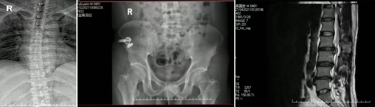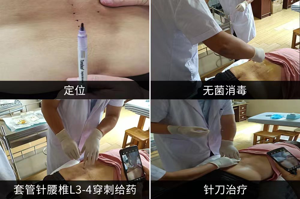 患者吴某安,男,40岁是一名大货车司机,1年前曾因左下肢麻痛,诊断为腰椎间盘突出症,后辗转多家医院治疗,左下肢麻痛反复,一天前因搬重物导致左下肢放射性疼痛加重,无法直立行走,腰椎向左侧凸,拍MR显示左侧1、腰椎退行性变:L2/3椎间盘膨出。L3/4椎间盘膨出并突出(左侧旁中央型),相应左侧椎间孔变窄,椎管狭窄。L4/5椎间盘膨出,相应双侧椎间孔变窄,椎管狭窄,相应水平后纵韧带钙化。查体:左直腿抬高40°,加强试验(+),完善相关检查并常规针灸推拿病情未见明显好转后遂决定进行腰椎穿刺注射合并针刀松解技术。治疗完毕后患者左下肢症状明显改善,三天康复训练治疗后患者脊柱侧弯幅度明显减小,左下肢无麻痛,直腿抬高实验65°加强试验(-),使原本需要手术治疗的患者免挨一刀,收获到患者的赞许。