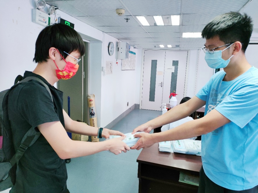 工作人员为同学发放口罩