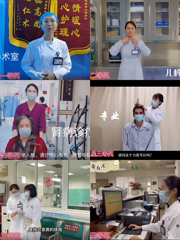 为弘扬南丁格尔精神,提升深圳市中医院护理服务品质,传递优质护理服务理念,护理部组织各科室拍摄“护理服务之星”小视频活动,评选出6名服务之星,她们分别是一等奖——门诊手术室黄少芬,二等奖——儿科病区张珂、肾病诊疗中心梁献莲,三等奖——肝病科二病区陈静仪、骨科二病区邓建婷、综合科病区王梦梦,并在护士节当天线上播放展示她们的服务风采。