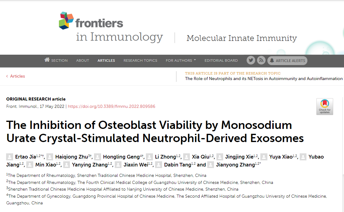 风湿病科张剑勇教授团队历经4年时间研究,在痛风骨破坏机制方面取得重大成果。 近日,该成果《The inhibition of osteoblast viability by monosodium urate crystal-stimulated neutrophil-derived exosomes》被Frontiers in Immunology发表。本期刊中科院医学大类学科及免疫学小类学科分区为 2 区,影响因子7.561,2021年即时影响因子8.627,并且是免疫学Top期刊。