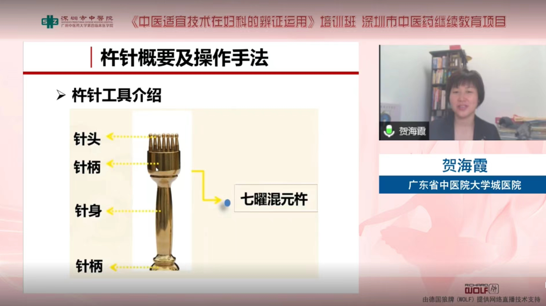 广东省中医院大学城妇科病区的贺海霞护士长分享了《杵针在妇科的应用》。杵针疗法是我国医学宝库中珍贵的遗产,它集针砭、按摩之长,承导引之术,融九宫河洛之法。贺海霞护士长清晰明了地为大家讲解了杵针的起源、中医理论知识等,并分享了杵针的临床应用。