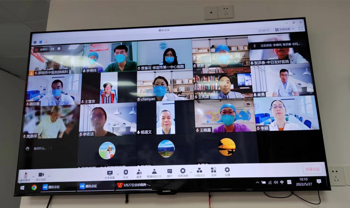 5月27日,中日友好医院晁恩祥国医大师中医肺病团队、深圳市中医院、中日友好医院、北京地坛医院、北京中医医院、保定市第一中心医院联合视频会诊了一例新冠肺炎患者,北京卫视《生命缘》节目组跟踪报道本次会诊。会诊由深圳市中医院呼吸与危重症医学科、深圳市新冠肺炎中医药防治专家组组长陈生主任医师与中日友好医院国家医疗队支援北京地坛医院专家组副组长李得民副主任医师主持。中日友好医院党委书记宋树立、副院长崔勇,国医大师晁恩祥,中华中医药学会兼肺系病分会主任委员张洪春主任医师及中日友好医院晁恩祥国医大师中医肺病团队成员郭丽萍主任医师、易丽主任医师,深圳市中医院呼吸与危重症医学陈生主任医师、谢纬主任医师、李敏芳副主任医师,北京地坛医院中西医结合中心主任王宪波主任医师,北京中医医院黄少霆医师,保定市第一中心医院肿瘤内科贾喜花主任医师等参加会诊。中日友好医院副院长崔勇致辞。中日友好医院国家医疗队支援北京地坛医院医疗组组长易丽主任医师汇报该病例相关资料。