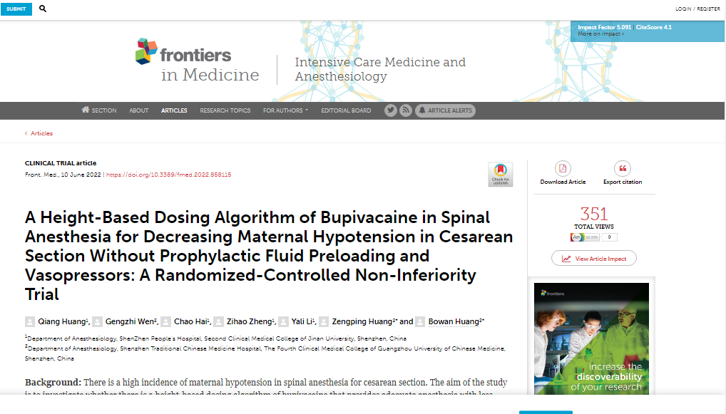 麻醉科引进人才初出成绩,黄伯万博士和黄增平主任团队历经3年时间研究,在剖宫产麻醉方面取得重要成果。近日,该成果《A height based dosing algorithm of bupivacaine in spinal anesthesia for decreasing maternal hypotension in caesarean section without prophylactic fluid preloading and vasopressors: a randomized-controlled non-inferiority trial》被Frontiers in Medicine期刊发表。黄伯万博士为该论文主通讯作者,黄增平主任为共同通讯作者。该期刊影响因子5.091。