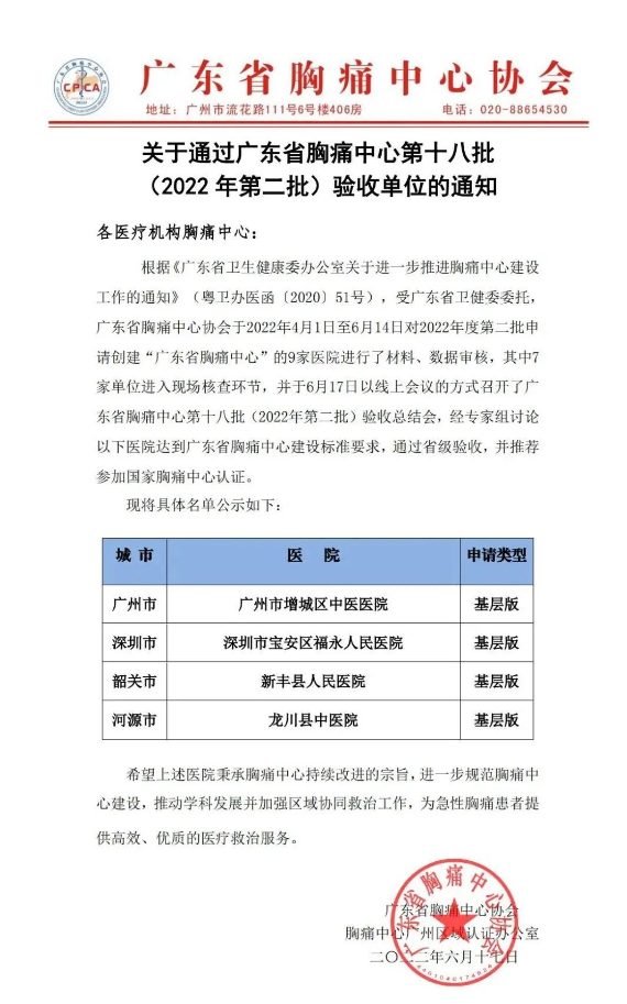 2022年6月22日,龙川县中医院胸痛中心经广东省胸痛中心协会专家组评审验收,达到广东省胸痛中心建设标准,成为河源市首家通过胸痛中心省级验收的中医医院。