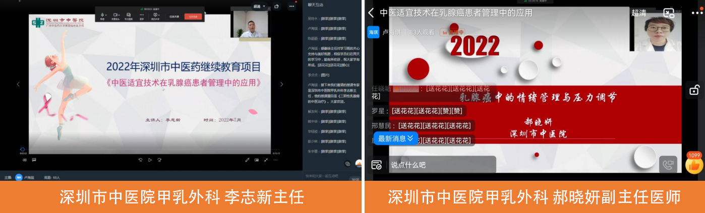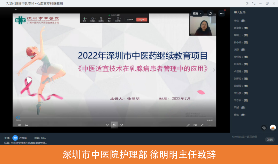 根据《中医药发展战略规划纲要(2016-2030)》指导思想,为进一步促进中医实用型护理人才的培养,充分发挥中医适宜技术在疾病治疗、康复及保健中的优势特色,切实提高中医医疗服务能力,7月15日,由深圳市中医院外科三、四、五病区主办的深圳市中医药继续教育项目《中医适宜技术在乳腺癌患者管理中的应用》顺利开班。本次学习班采取线上直播模式,为期两天,反响热烈,报名参会学员300余人。