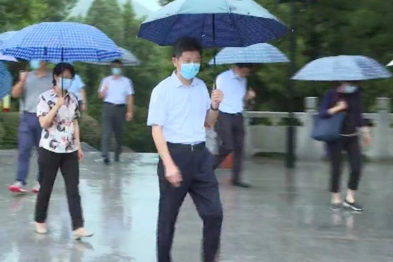 人社部留学人员和专家服务中心党委副书记、主任沈水生冒雨带领科技服务团前往金寨县红军广场