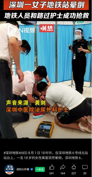 2022年8月1日18时左右,一名年轻女乘客在深圳北站突然晕倒,站内工作人员立即为其实施抢救。深圳市中医院外二科病区护士龚剑刚好路过现场,在表明医护人员身份后,立即参与协助救援。10分钟后,120急救人员来到现场并转送该乘客前往医院进一步救治,后获悉该乘客已脱离生命危险。