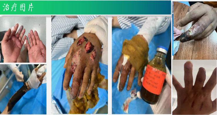 ● 入院留取血培养和伤口分泌物培养后,即刻予静脉输注舒普深抗感染、补液,于手掌背侧及中指两侧方划开以减压引流,并予纱布湿敷院内制剂复方二妙溶液,手臂外敷清热消肿膏。