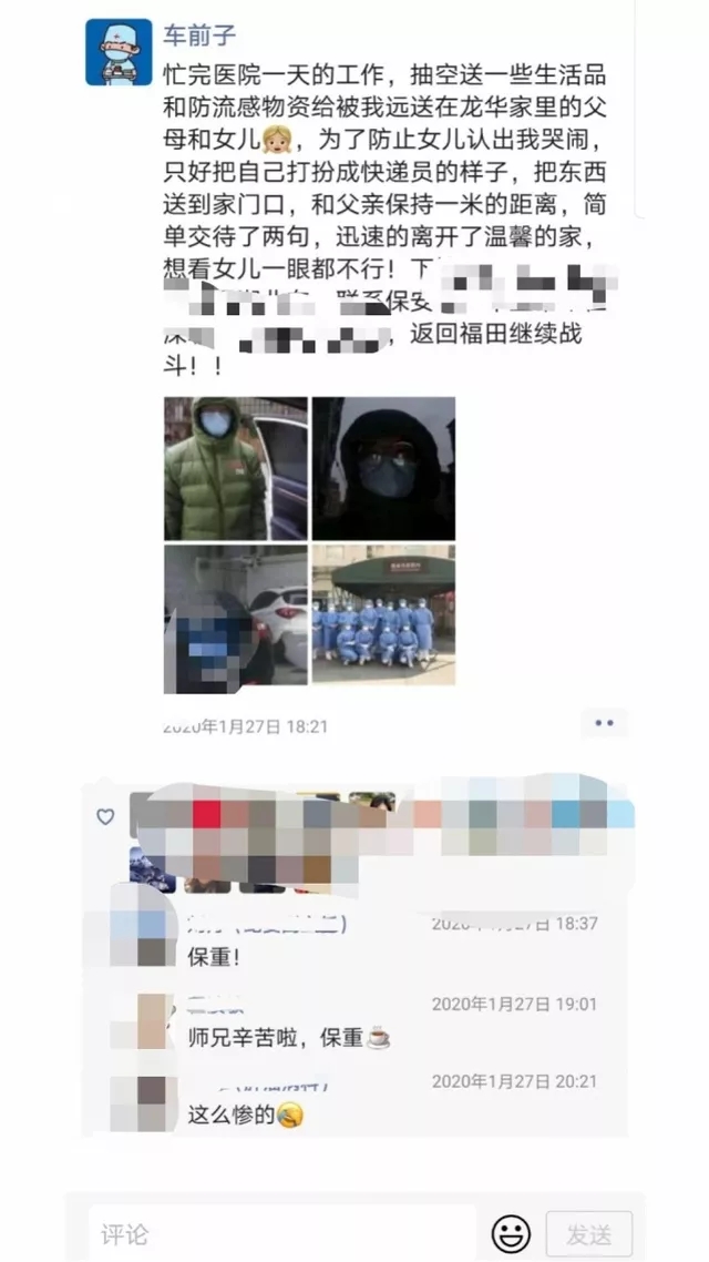 1月27日,在忙完工作后,车医生抽空给自己在龙华的父母和女儿送了一些生活用品和防流感物资。为了防止女儿认出自己,舍不得让自己离开而哭闹,他只好把自己打扮成“快递员”的样子,把东西放到家门口,和父亲保持一米的距离,简单交代了两句,就匆匆离开了。车医生表示,平时女儿跟他们夫妇住在一起,很黏自己。这次,转眼有一周没见女儿了,主动与家人隔离是防患于未然。
