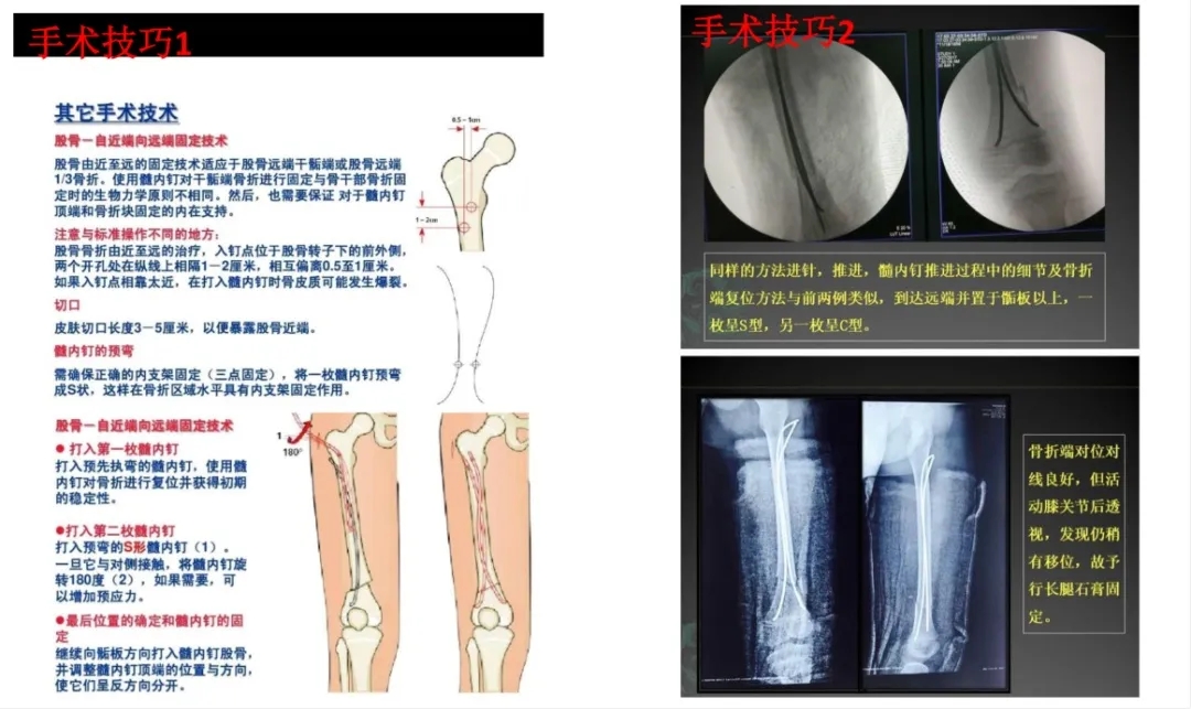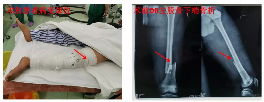 下乡第二周,医院来了一个因车祸导致左下肢股骨远端骨折的13岁小男孩。考虑患者年龄较小,骨折部位处于股骨远端,骨骺线未闭合,行传统的钢板内固定对患者损伤较大,可能影响生长发育。用传统的股骨弹性髓内钉标准双侧入路容易损伤该患者股骨下端骨骺和对骨折部位固定不稳定。综合以上情况后,我与深圳市中医院骨一科创伤组组长余阗主任取得联系,讨论后余主任建议我采取从股骨上端单侧入路行弹性髓内钉固定治疗股骨下端骨折,该术式难度较大,对医师的解剖知识要求较高,属于近年的新技术。在充分的术前准备和医护术中密切的配合下成功的开展了该项手术,得到了帮扶医院和患者家属的肯定。
