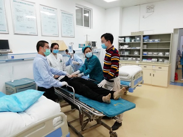 广西百色隆林各族自治县人民医院是深圳市中医院对口帮扶单位。4月15日下午6点,深圳市中医院派驻当地支援的医疗队员贾二涛、马笃军医生下班后刚走出医院不远,突然听到一声大叫,循声望去,发现一位大约50岁的男性路人晕倒在地。贾二涛、马笃军医生马上冲过去,发现患者意识不清、四肢抽搐、口吐白沫、面色紫绀,考虑为“癫痫”。此时如果没有紧急处理,正确保护气道,患者有可能因为误吸而致窒息,严重会有生命危险。时间紧迫,贾二涛医生立即进行现场救治,保障患者气道畅通。马笃军医生则立即赶往医院急诊科,在2分钟内与急诊科医护一同推着平车,携带抢救箱来到患者身边。贾二涛、马笃军医生协助急诊科医护人员将患者抬上平车,送至抢救室,马上进行吸氧、监护、镇静等处理,同时与急诊科医生做好交接,待到患者病情平稳后,贾二涛、马笃军医生才放心离开。