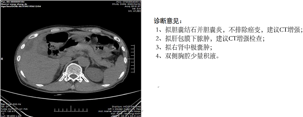 因患者病情危重,值班医生立即汇报科室相关负责人,深圳市中医院派驻龙川县中医院组团式帮扶成员外科李嘉主治医师(龙川县中医院外一科名誉科主任)收到通知后也立即返回医院。李嘉医生查看患者,仔细评估其CT后,认为平扫CT提示胆囊癌以及肝脓肿诊断尚需完善增强CT证实。考虑患者目前胆囊周边炎症异常明显,胆囊三角解剖关系混乱,手术风险大,切除胆囊困难,先予以保守治疗的同时抓紧时间完善相关检查。