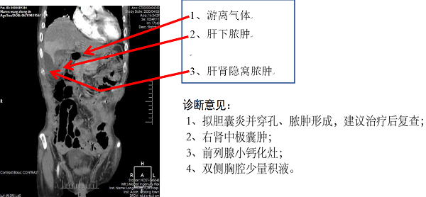 与此同时,腹部增强CT提示患者胆囊穿孔,游离气体溢出腹腔,并腹腔多处脓肿形成,感染较重导致炎症指标明显升高,不排除逐渐发展至感染性休克的风险,病情危急。