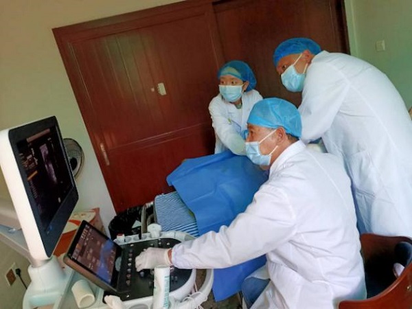 患者高龄且存在较为严重糖尿病,这些均为治疗胆囊穿孔并脓肿的严重不利因素。有鉴于此,李嘉医生与科室主任谢闻文向医务科汇报,在受援医院领导的协调下组织了全院MDT讨论。MDT讨论最终确定出先行B超引导下精准穿刺,如穿刺效果不理想,随时准备腹腔镜探查的治疗方案。