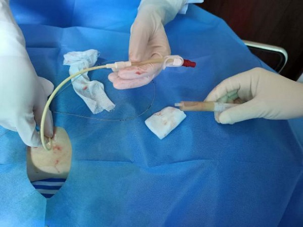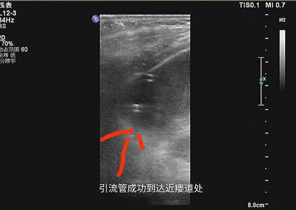 4月9号下午四点,在完善各种医疗文书工作以及各项术前准备后,李嘉医生在B超引导下对患者行腹腔多发脓肿精准穿刺引流。该院B超室团队细致、耐心地引导穿刺导丝以及穿刺针成功地在不到1.3cm的间隙中,避开了肠道以及右肝外叶,将5mm的引流导管头部精准引导入肝下脓肿处。同时引流导管侧孔无偏差地对准于肝肾隐窝脓肿处,精确地引流出两处脓肿,完美地达到术前既定方针。
