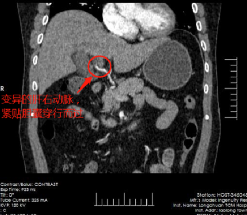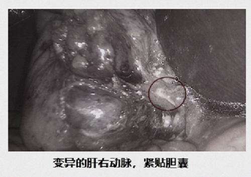 深圳市中医院派驻龙川县中医院的外科骨干李嘉硕士,检查后认为患者进行胆囊切除势在必行,但完善相关检查,发现患者存在三大手术难点:其一,患者过度肥胖,器官组织脂肪沉积,术中显露存在一定困难;其二,因多次腹痛频繁发作,胆囊充血水肿炎症偏重,渗出较多,解剖关系不清晰;其三最为重要,患者肝动脉变异,肝右动脉为右侧肝脏的主要供血动脉,多数均在肝门处稍低位进入肝脏,但患者肝右动脉显著降低至距离切除胆囊壁不足2毫米处汇入右侧肝脏,手术中一旦损伤此动脉,鲜血将喷射而出,后果不堪设想。根据综合评判,患者胆囊归类为四级胆囊,手术难度在胆囊切除术中属于最高级别,需要技术成熟的手术团队方可顺利切除。
