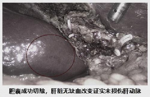 与术前预想一致,患者因频发腹痛导致胆囊充血水肿僵硬,显露分离困难,且肝右动脉紧贴胆囊穿行汇入肝脏,外一科手术团队仔细辨认组织关系后分离胆囊,巧妙地避开了粗大搏动的肝右动脉,成功切除病变胆囊,术中出血不到20ml,手术顺利完成。
