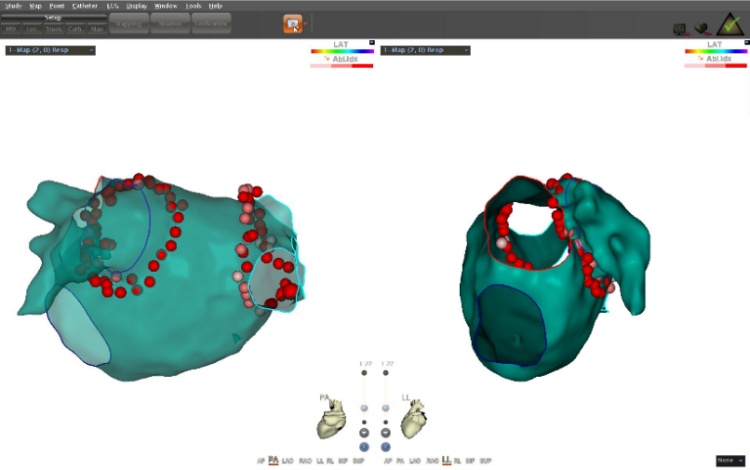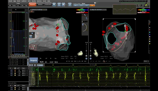 AI房颤精准消融病例:林某,男,80岁,阵发性心悸8年入院,诊断为“阵发性房颤”。由于心悸频发,心情烦躁,夜间经常惊醒,患者不堪其扰,反复住院。心血管病科栾杰男主任认真查看患者后,建议采用射频消融术治疗。但由于患者高龄,合并糖尿病及冠心病,须做好充分准备,手术须认真谨慎,不做过多操作,达到安全精准治疗。术者匡荣仁副主任医师与患者及家属充分交流后,术前行左房增强CT排除心房内血栓,并CT三维重建了解肺静脉解剖。术中局麻下穿刺房间隔成功后,在Carto 3系统下建模,模型与CT三维重建效果图吻合。随后使用ST(压力)消融大头行环肺静脉消融术,根据患者状况AI指数控制在前壁400-450之间、后壁350-400之间。术前患者心电图为房颤律,消融过程中房颤转为窦律。经过验证肺静脉电位隔离成功,手术过程顺利,无过多消融,患者耐受度良好。
