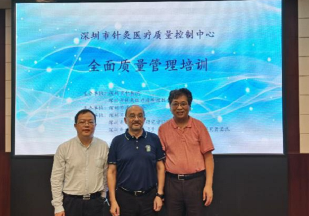 中国质量协会认证的全面质量管理咨询师伍强专家、深圳市质量协会李榕会长与深圳市针灸医疗质量控制中心于海波主任合影