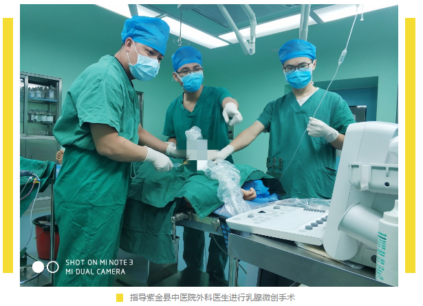然后,我的工作重心从帮转变到扶。我们首次开展了乳腺微创旋切手术,由于当地医生在该手术的理论原理、操作过程、手术风险等方面均较为薄弱,早期以帮为主,由我进行乳腺微创旋切手术,结合实际病例,边手术边讲解。到后期当地医生有了一定基础,则转帮为扶,从旁指导当地医生进行手术,纠正不足之处,给予信心支撑,协助当地医生独立进行乳腺微创旋切手术,把这项技术授渔于紫金县。