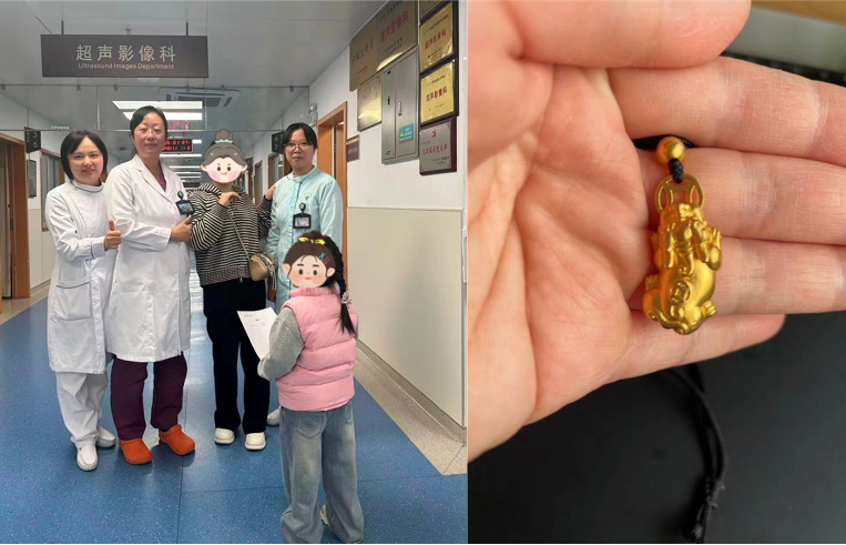2026年1月6日下午,超声影像科一如既往地忙碌着。前台工作人员赵佩丽按照惯例为各诊室补充物资,当她来到15号诊室门口时,发现地面闪烁着“金光”。起初她以为是工作繁忙导致视觉疲劳,定睛一看,原来是一枚貔貅造型的金子吊坠。她连忙捡起,询问周围是否有人丢失首饰,却无人应答。深知遗失贵重物品的焦急,她迅速将这枚珍贵的饰品交给了科室负责人妥善保管,并向相关职能部门汇报。